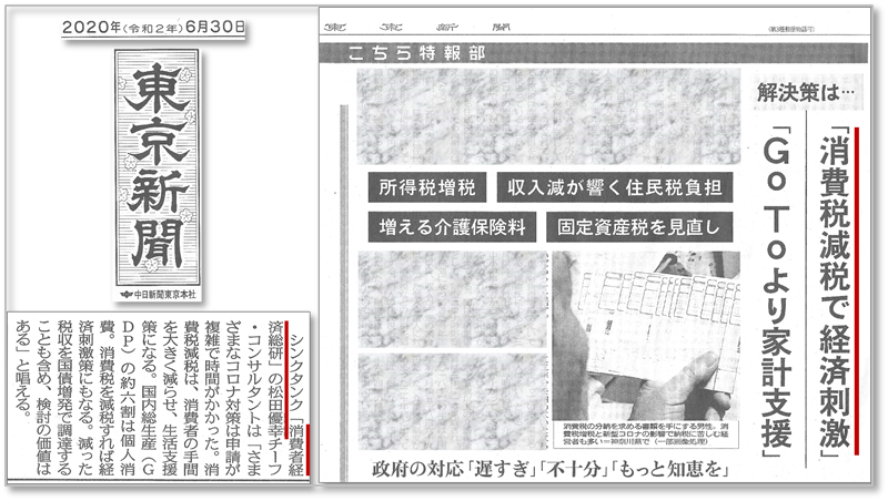 ![]() ■東京新聞から、筆者(松田)が、取材を受け、 消費税の減税に関する内容が掲載されました 。 ■番組出演・執筆・講演等のご依頼は、 お電話・メールにてご連絡下さい。 ■最新稿:2021年3月14日 本ページは、修正・加筆等で、 上書き更新されていく場合があります。 ■ご注意 このテーマに関連し、なにがしかの判断をなさる際は、 自らの責任において十分にかつ慎重に検証の上、 対応して下さい。また「免責事項」をお読みください。 |